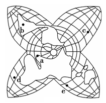4、单选题 图为地球星瓣图,图中a为陆地相对集中的“陆半球”的极点(38°N,0°),据此回答下列问题。
