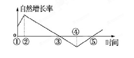 本题解析:本题考查人口增长和读图分析能力。人口自然增长率体现人口增长的速度,但是不能体现一个地区的人口总数。A选项,④时期人口自然增长率为负值,带来的人口问题是人口增长缓慢,人口数量减少,人口老龄化,所以A叙述错误;③-⑤期间虽然由④-⑤期间人口自然增长率增大,但人口自然增长率仍为负值,所以人口总数一直减少,所以B选项正确。②时期人口自然增长率高,属于经济发展水平较低时期,所以C错误;D选项自然增长率由高水平逐渐降低,反映经济发展水平不断提高,所以D错误。所以本题选择B选项。