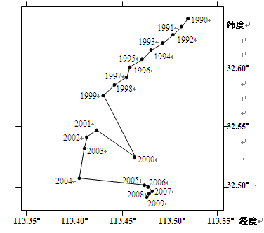 小题1:由图中信息可以判断,人口重心移动趋势由东北向西南;人口重心每年移动距离大小不一样;从图中信息无法判断人口数量的多少;人口重心移动距离南北超过0.15°,1°大约为111千米,距离超过15千米。正确答案选A。