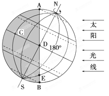 (3) 图中A地的昼长为      小时,E地的日出时间为      时,B点的日落时间为     时。
