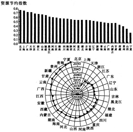 2、单选题 读全国31个省、市、自治区资源节约指数排序图和实现资源消耗 “零增长”时间图,回答1~2题。