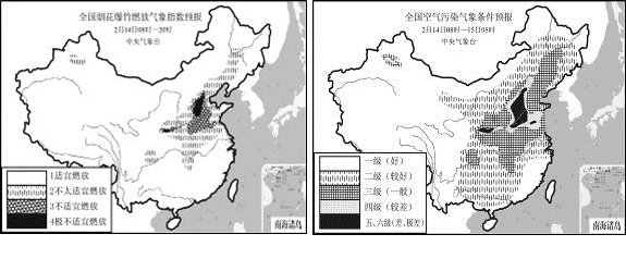 4、单选题 烟花爆竹燃放气象指数根据未来气象条件和空气质量的变化情况综合分析得出,空气污染气象条件主要分析是否有利于污染物的扩散和稀释。下图为2月14日烟花爆竹燃放气象指数预报与空气污染气象条件预报。据此回答下列小题。