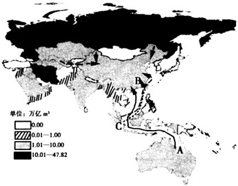 (3)2010年11月20日,一艘轮船从A地出发,按图中航线(实线)历时半个月运输该能源前往B地区,航行过程中正午太阳高度的变化情况是_________________;影响途经沿岸陆地自然带变化的最主要因素是________。