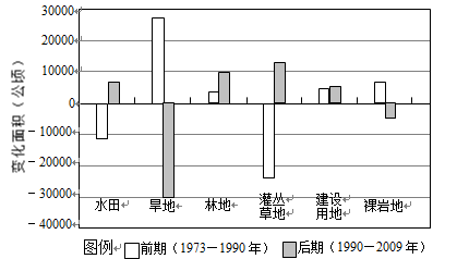 5、单选题 下图为我国西南地区某流域1973~2009年部分土地利用类型面积变化图。读图回答下列问题。