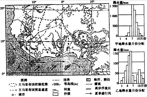(2)比较甲、乙两地6~8月降水量的主要差异,并分析原因。