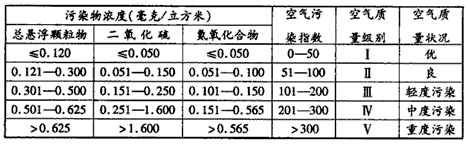 ? 空气污染物浓度、空气污染指数、空气质量级别气空气质量状况对照表(总悬浮颗粒物中颗粒直径小于10微米的被称为可吸入颗粒,氮氧化合物主要指一氧化氮和二氧化氮)。