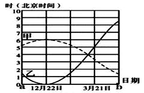 【小题2】从3月21 到b段,甲地日出时间早于乙地,说明甲地昼长大于乙地,时间大约45天,故选A项正确。