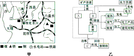 4、综合题 钢铁工业是四川省攀枝花市的主导工业部门。下图中图甲是攀枝花市及其附近地区简图,图乙是设想的以攀枝花钢铁工业为基础的生产流程模式图,读图回答下列问题。