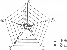 5、单选题 图3表示上海和浙江钢铁、化纤、木材加工、饮料、电子信息等五种工业竞争力大小示意图(数值越大表示竞争力越强),读图回答下题。