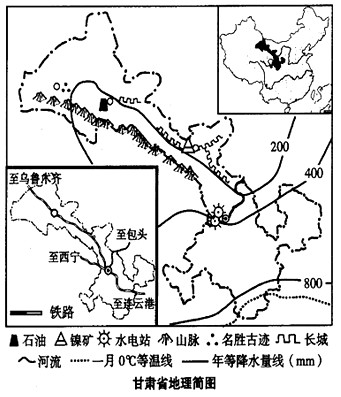 1、综合题 阅读“甘肃省地理简图”,结合已掌握的地理知识,归纳甘肃省自然地理特征,并就该省的经济发展作相关分析。