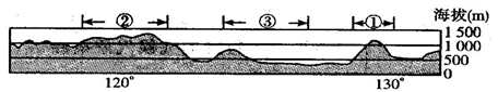 1、单选题 读我国沿45°N某地的地形剖面图,回答下列各题。