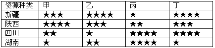 2、单选题 下表反映了我国四个省区煤炭、太阳辐射能、天然气、水能四种资源的丰歉程度(★号越多代表资源分布越丰富),据此回答下列各题。