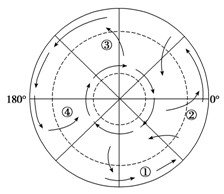 5、单选题 下图是“以极点为中心的半球俯视图”,箭头表示洋流的分布位置及流向。读图回答以下问题。
