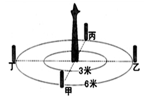 3、单选题 我国某中学建了一座太阳历广场,广场中间是6米高的雕像柱.某生在进行观察学习时发现,当其位于甲处时,正好看到北极星于雕像柱的顶点重合.北京时间11:24时是一天中雕像柱影子最短的时刻,(注:图中3米和6米为半径)回答9-10题