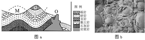 4、综合题  (14分)下图中图a是某地的地质剖面图, 图b是O地某处花岗岩球状地貌景观图。据此完成下列问题。