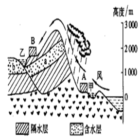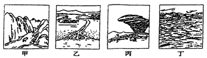 (2)乙处的地质构造是?,乙处发育成河,主要是因为岩石破碎、易受___。