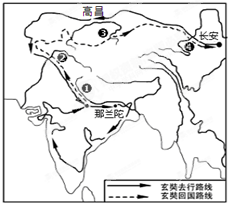小题2:长安位于我国秦岭淮河以北的季风气候区,故判断为温带季风气候;高昌位于我国塔里木盆地内,为温带大陆性气候;那烂陀位于印度恒河流域,为热带季风气候。