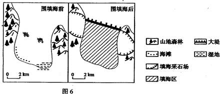 5、综合题  图6是某海湾围海造地前后的对比图。指出围填海前后的变化,并就其中一项变化,说明其对环境带来的负面影响及对策。(10分)