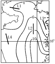 【小题2】由图可知:图中L2处为暖流,因为L2处水温比两侧要高;L3为沿岸寒流,因为根据等温线判断图示区域位于北半球,2月份北半球为冬季,陆地气温低,故L3水温较低;L1为暖流,根据等温线弯曲形状可判断L1处水温比两侧要高;L4为寒流,因为L4是由高纬流向低纬的。
