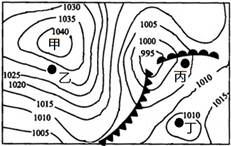 【小题1】甲处为高压中心,垂直方向气流以下沉为主,故A错误;乙处风向为东北风,故B错误;气压值:1000<丙处<1005 ,1005<丁处<1010,故丙、丁两处的气压差为0--10百帕,C正确;甲处等压线稀疏,乙处等压线密集,故乙处风速大于甲处D错误。
