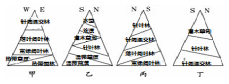 1、单选题 下图为“四地山地植被垂直分布示意图”,甲地位于南半球,其余均位于我国。