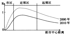 3、单选题 一个城市制造业就业密度与服务业就业密度的比值,通常用R值表示。下图示意我国某特大城市2000年和2010年R值随距市中心距离的分布曲线,读图,回答1—2题。