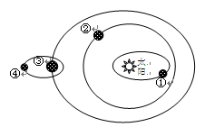 2、单选题 太阳系(局部)示意图,图中①②③为距离太阳最近的大天体,椭圆为天体的运行轨道。读图回答问题。