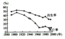 2、单选题 下图为“某国人口出生率和死亡率统计图”,读图完成(1)——(2)题。