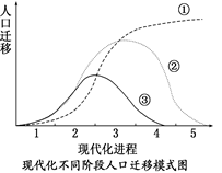 (3)材料4中曲线①②③分别代表____人口迁移、____人口迁移和____人口迁移,我国目前最主要的人口迁移类型是____人口迁移。