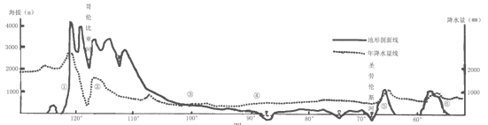 1、单选题 图是沿49°N的地形剖面图和年降水量分布图。读图,回答下列各题