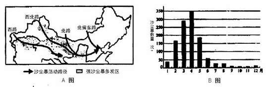 (2)B图所示的沙尘暴季节分布特点是?,其主要的自然原因是?。(2分)