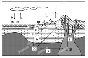 小题2:海岸沙滩地区主要沉积物来自于河流携带的泥沙,即e环节带来的,A对。g、j、k环节形成的是沉积岩、变质岩、沉积岩,没有岩浆岩,B错。H环节是变质作用,i环节属于地壳运动,l环节属于岩浆活动,C错。读图分析,①为沉积岩,②为变质岩,③为岩浆岩。②③类岩石不能直接转化,D错。