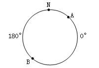 5、单选题 图中N为北极点,A、B为晨昏圈与0°、180°经线圈的相交点,⌒AN小于⌒BN,A点地方时是21时。读图回答下列各题。