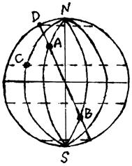 3、综合题 该图中北极地区位于昼半球(DAB曲线为晨昏线的一部分),图中虚线分别为回归线和极圈,请回答下列问题。