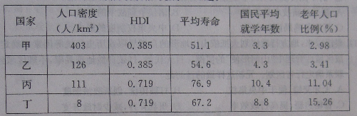 2、单选题 联合国历年发布的“人类发展程度指标( HDI)”,是以“预期寿命、教育水准和生活质量”三项基础变量按照一定计算方法组成的综合指标,用来衡量各国的发展水平。下表为四个国家2010年的统计资料,阅读分析表格,完成下列问题。