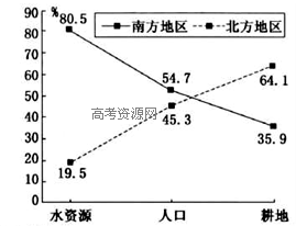 1、单选题 读下面“我国南、北方水资源、人口及耕地分布对照图”,回答以下问题。