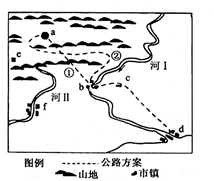 本题解析:修建b镇到a镇的公路有①②两个线路方案,较为合理的是②,理由是线路比较平缓;修建b镇到d镇的公路没走直线,绕道经过c镇的原因是考虑社会经济因素;为达到线路的技术要求,在山区地区修建公路往往需要迂回前进;a-b与b-d是两条同等级公路,影响其修建的主要经济因素是社会经济因素。