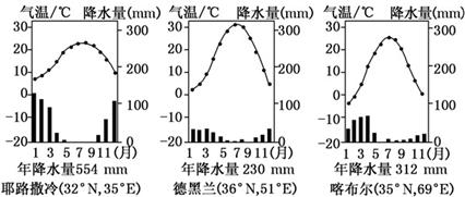 1、单选题 该图为西亚三个城市的气温、降水量图。完成问题。