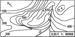 【小题1】河流处海拔较低,根据等高线判读规律可知,此处等值线凸向高值方向,因此根据图中等高线凸出方向和指向标可以确定河流自东南流向西北方向。