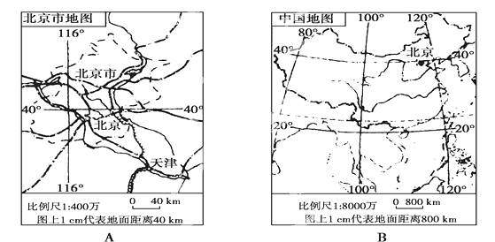 (1)A图比例尺________(填“大于”或“小于”)B图比例尺。( 2分 )