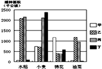 5、单选题 下图为我国四省区水稻、小麦、棉花、油菜播种面积统计图,读图回答1—2题。