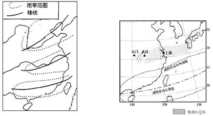 (2)据右图,指出梅雨区与副热带高压的位置关系,并简析副热带高压强弱与武汉上海地区梅雨的关系。(6分)