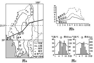 4¡¢×ÛºÏÌâ ͼaΪÃåµé²¿·ÖÇøÓòʾÒâͼ£¬Í¼bΪÒÁÂåÍßµ×½¢ÙµØµÄÄêˮλ±ä»¯Í¼£¬Í¼cΪͼaÖТڢÛÁ½µØµÄÆøÎºͽµË®Á¿Í¼¡£½áºÏËùѧ֪ʶ»Ø´ðÏÂÁÐÎÊÌâ¡££¨11·Ö£©