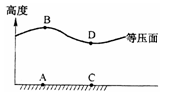 本题解析:本题考查热力环流。由于地面冷热不均而形成的空气环流,它是大气运动最简单的形式。受热地区近地面气压低,受冷地区近地面气压高,高压处等压面向上凸起;低压处等压面向下凹陷。A地气压低,温度高,空气上升;BD两点位于同一等压面,气压相等;C地气压高,所以气流由C流向A;四点中气压最高的为C点。所以本题选择C选项。