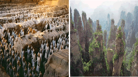 4、综合题 下左图为秦陵兵马俑图,下右图为武陵源图。读图,回答下列问题。