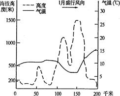 小题2:以山地最高岭为分界线,则气温最低处位于山地的北坡,根据最低气温对应的海拔高度可看出,海拔大约为 500--1500 m。
