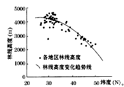 本题考查山地垂直自然带的分布。高山林线在30°N附近高低变化大,变化最为剧烈;高山林线分布的总体趋势是纬度越高,林线越低,30°N以南地区林线降低因为海拔较高,气温较低。所以本题选择C选项。
