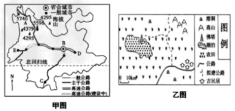 材料二:下图中甲图为云南省略图,乙图为云南省某小区域旅游资源分布图。