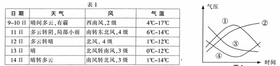 【小题2】11日只有局部小雨,对霾消散影响不大,A错。气压升高,应是下沉气流,B错。气流下沉,不容易消散,C错。表中风力这两日最大,有利于霾消散,D对。