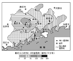【小题2】图中珠三角PM2.5浓度偏高,主要是因为人口稠密,汽车数量大,A正确。天气返潮,微风少雨,悬浮颗粒多,B正确。经济发达,工厂企业多,排放的废气多,C正确。强冷空气南下,气温下降,不是浓度偏高的主要原因,D不正确。
